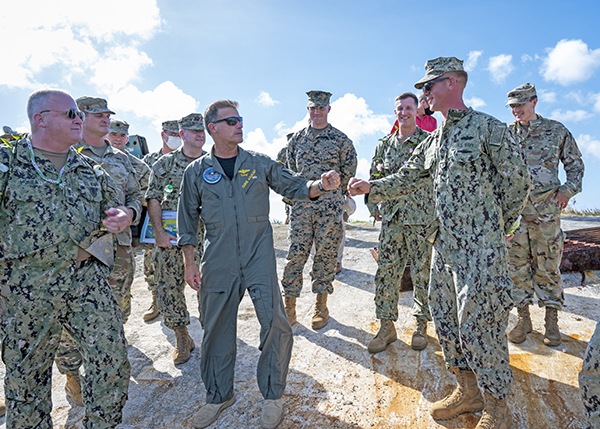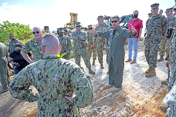 Adm. John C. Aquilino, commander of U.S. Indo-Pacific Command, center, speaks with service members during an orientation of Tinian Harbor. (U.S. NAVY/MCS1 ANTHONY J. RIVERA)