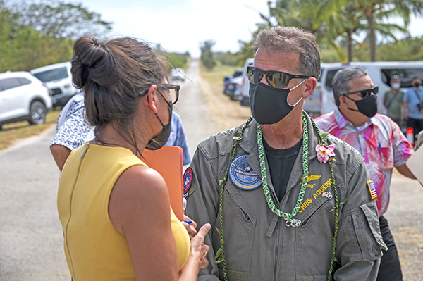 Adm. John C. Aquilino, commander of U.S. Indo-Pacific Command, right, speaks with Kimberlyn King-Hinds, chairperson of the Commonwealth Ports Authority board, during a groundbreaking ceremony for the Department of Defense’s multimillion dollar divert airfield project on Tinian. (U.S. NAVY/MCS1 ANTHONY J. RIVERA)