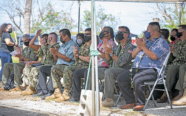 Adm. John C. Aquilino, commander of U.S. Indo-Pacific Command, and audience applaud during a groundbreaking ceremony for the Department of Defense’s multimillion dollar divert airfield project on Tinian. (U.S. NAVY/MCS1 ANTHONY J. RIVERA)