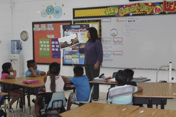 Dr. Rita Sablan, former education commissioner and literacy coach, reads to a 2A class at the Tinian Elementary School. (Contributed Photo)