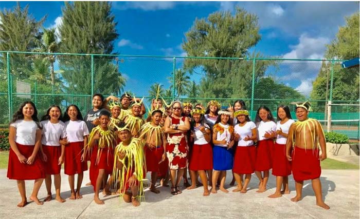 Members of the Hopwood Middle School Carolinian dance group pose with Marianas Tourism Education Council chair Vicky Benavente, center, before their opening performance at the MTEC Tourism Summit on Jan. 25, 2018, at Fiesta Resort & Spa Saipan. (Contributed Photos)