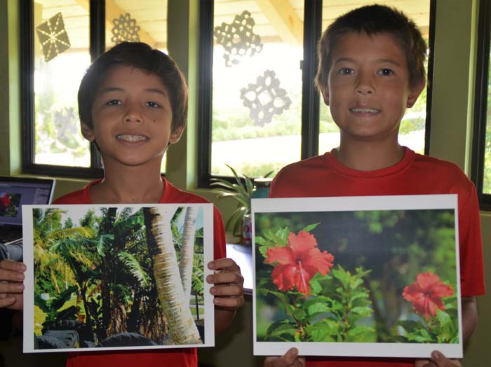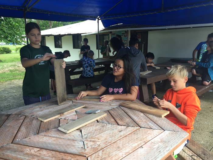 The youngest students, aged 4 and 5, had help creating a framed collage of photographed hearts formed by the preschoolers’ hands. The lower elementary students in grades 1 to 3 created a map of the Northern Marianas using their fingerprints and colored paint. The upper elementary students worked together to create a collage of local nature photographs. Taking used pallets, the middle school students sanded and painted them to create original wall hangings. This is an event that is organized by parents, and everyone at Whispering Palms has a part to play in preparing for the auction, from organizing, selling tickets, collecting auction items, to set up for the event.