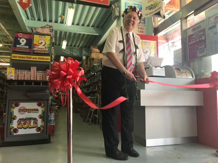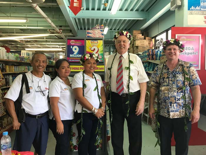 Northern Marianas Sports Association president Michael White, second from right, is joined by Pacific Lotteries CEO Stephen Gibson, rightmost, and staff at the launching of PowerBall/Pacific Gold lotteries at the XO Market on Nov. 13, 2017. (Contributed Photo)