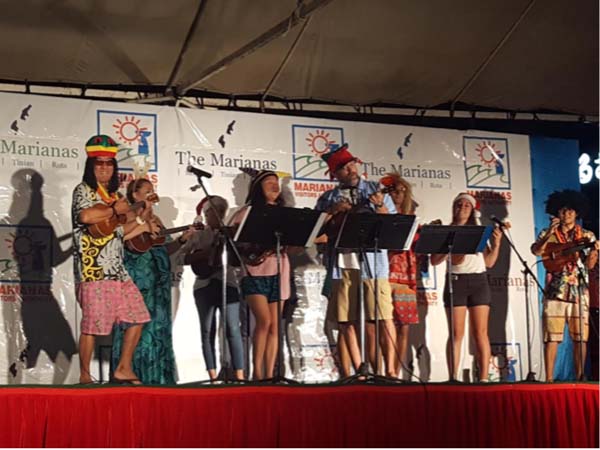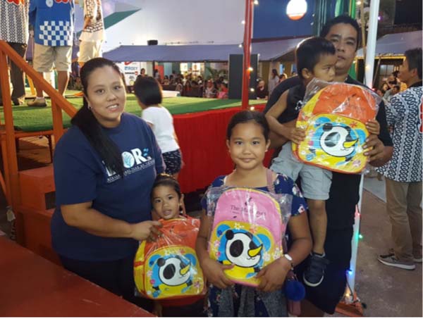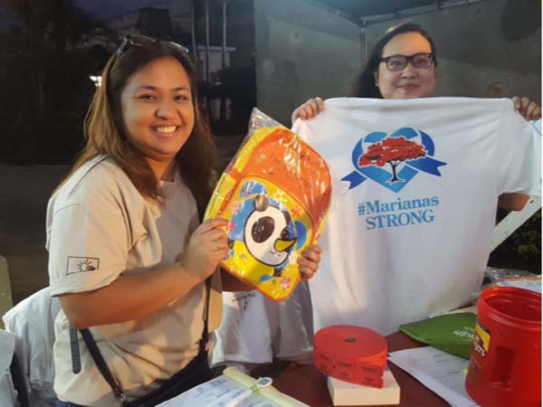 Marianas Visitors Authority chief accountant Joanne Paraiso, left, and accountant Jadel Ignacio give out Saipan-da backpacks and sell fundraising T-shirts at the #MarianasSTRONG Year-end Celebration, on Dec. 29, 2018, in Garapan. Proceeds of the event will be given to Karidat Social Services and other organizations providing relief assistance following Super Typhoon Yutu.