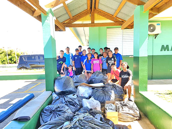 CNMI national youth team players and NMIFA staff members pose with the trash and debris they collected during a cleanup drive at the Koblerville Elementary School last Saturday. (Contributed Photo)