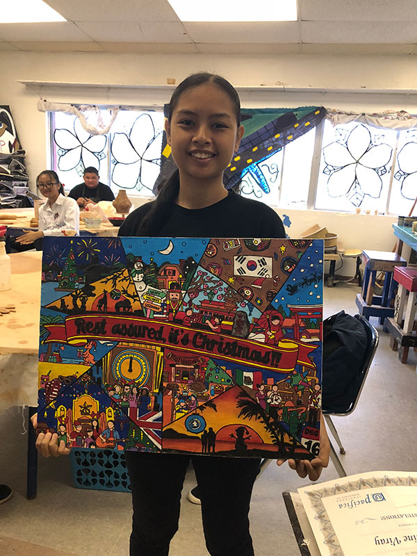 Jenny Wu Zhang, of the Saipan Community School student, holds her winning artwork for Category 1 (ages 6-11 division). (Contributed Photos)